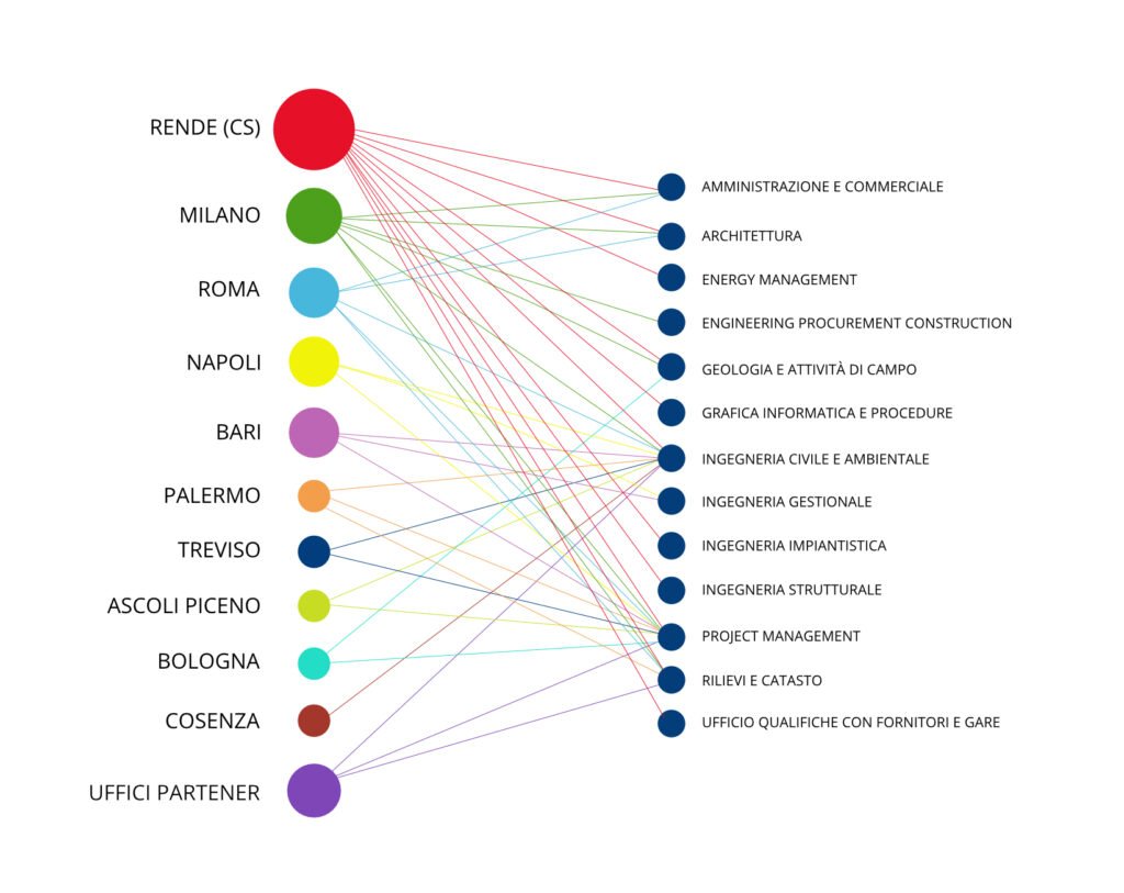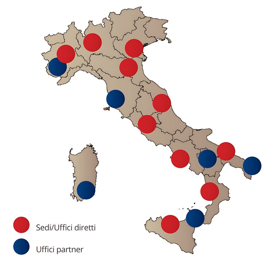 La Società opera su tutto il territorio nazionale attraverso uffici con personale diretto ma anche attraverso una fitta e capillare rete di professionisti di comprovata esperienza. Questi ultimi, essendo residenti e operativi nelle diverse regioni d’Italia, assicurano un’approfondita conoscenza del territorio di riferimento e dei diversi aspetti burocratici a livello locale.